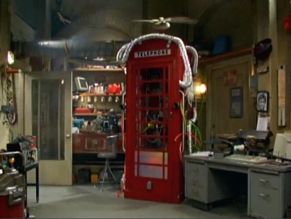 The Parallel Universalizer looks like a modified London phone booth. Inside the P.U. are a heap of buttons, a swipe machine and many wires. On top of this is a fan.